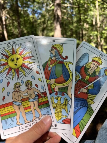Aujourd’hui, je travaille principalement avec les 22 arcanes majeures du Tarot de Marseille, que j’utilise comme un outil vibratoire de lecture psychique.